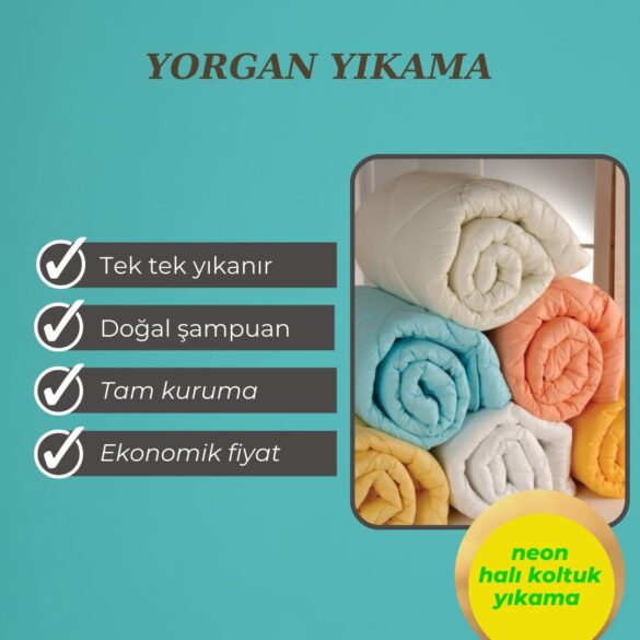 Bursa Yorgan Yıkama hizmetimizde, yün, pamuk, elyaf yorgan ve battaniyeleriniz uygun sıcaklık ve biyolojik deterjanlarla endüstriyel ekipmanlarla ,diğer müşterilerin yorganlarına değmeden tek tek yıkanmaktadır.